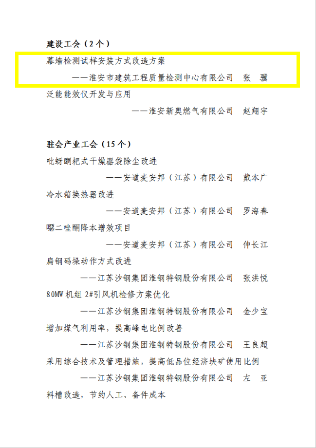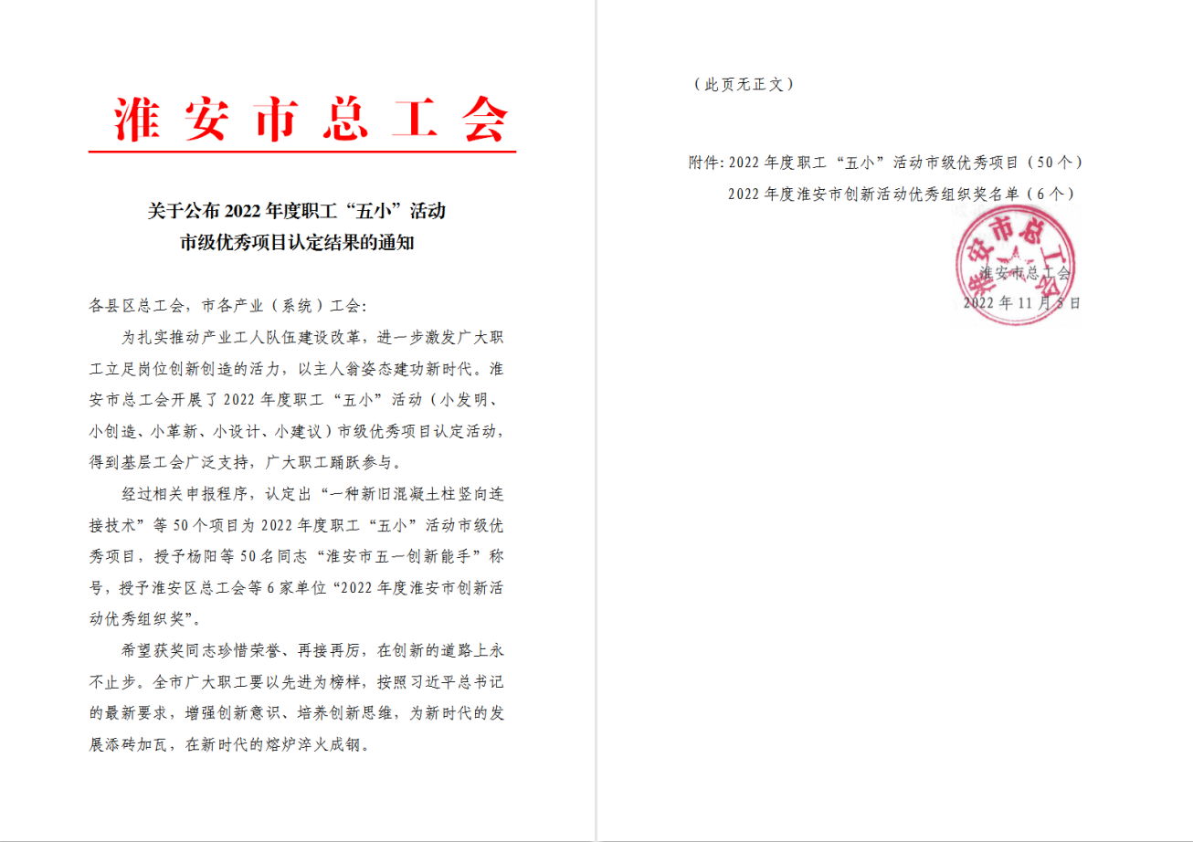 為扎實(shí)推動(dòng)產(chǎn)業(yè)工人隊(duì)伍建設(shè)改革,激發(fā)廣大職工立足崗位創(chuàng)新創(chuàng)造的活力,提升產(chǎn)業(yè)工人技能水平?;窗彩锌偣?huì)在全市開(kāi)展2022年“五小”活動(dòng)典型案例評(píng)選活動(dòng),檢測(cè)中心節(jié)能所提交的《幕墻檢測(cè)試樣安裝方式改造方案》項(xiàng)目被列入2022年度職工“五小”活動(dòng)市級(jí)優(yōu)秀項(xiàng)目,張?bào)K同志被淮安市總工會(huì)授予“淮安市五一創(chuàng)新能手”稱(chēng)號(hào)。